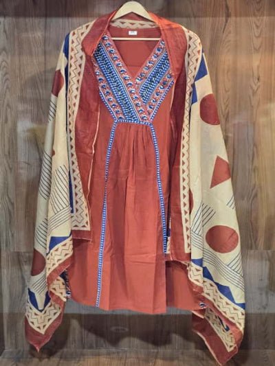 Rust Brown Cotton Printed Anarkali Suit Set