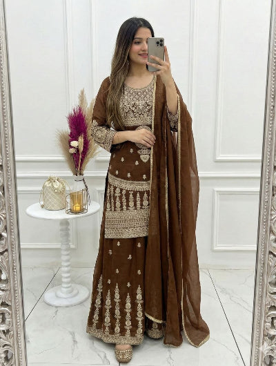 Taupe Brown Intricate Sequence Work Sharara Palazzo Suit