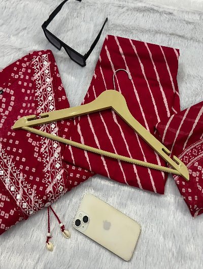 Beautiful Pink Bandhani Embroidery Cotton Straight Suit Set