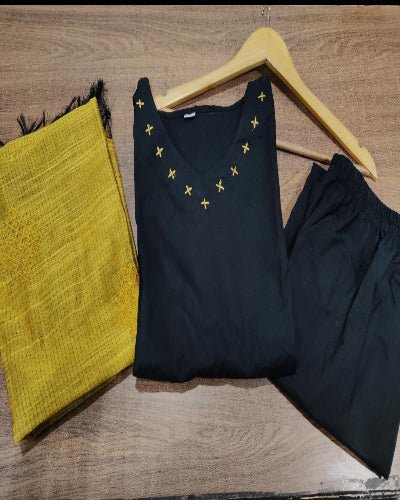 Black Cotton Embroidery Straight Suit With Mustard Dupattta