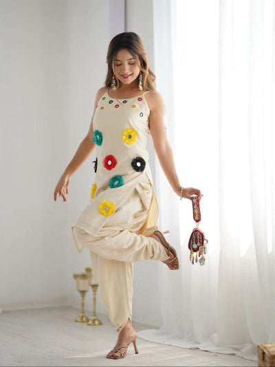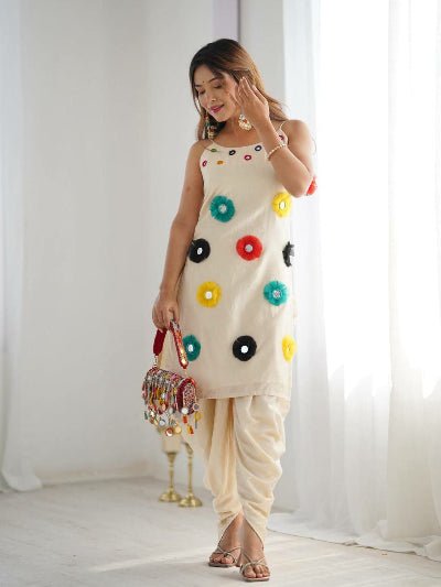 Off White Khadi Cotton Mirror Khatli Work Punjabi Dhoti Kurti Set Of 2