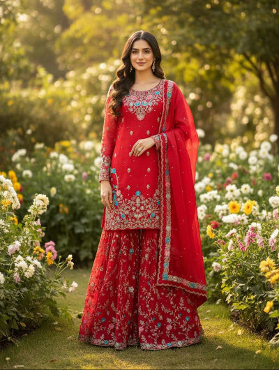 Red Georgette Fancy Embroidered Sharara Suit Set