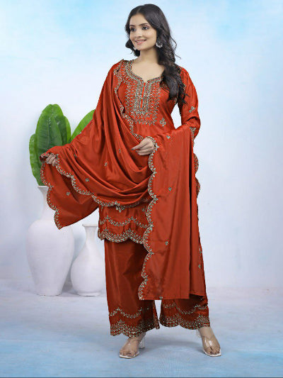 Rust Orange Gold Embroidery Work Palazzo Suit