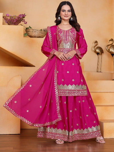 Magenta Pink Chinon Silk Embroidered Sharara Set