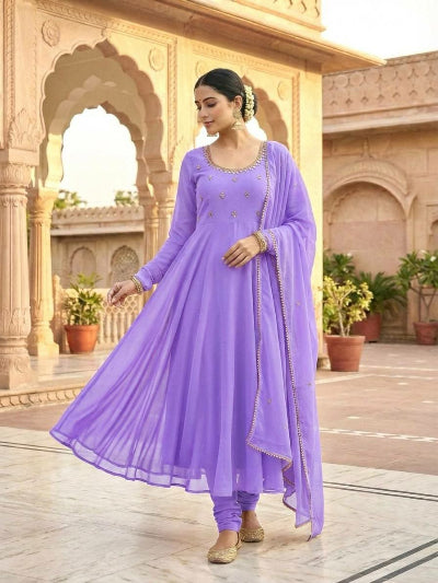 Elegant Purple Crunchy Silk Embroidery Work Anarkali Suit