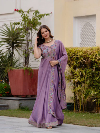Lilac Designer Embroidery Anarkali Gown Dupatta Set Of 2