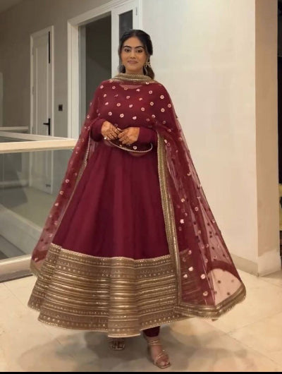 Maroon Gold Embroidered Roman Silk Anarkali Suit