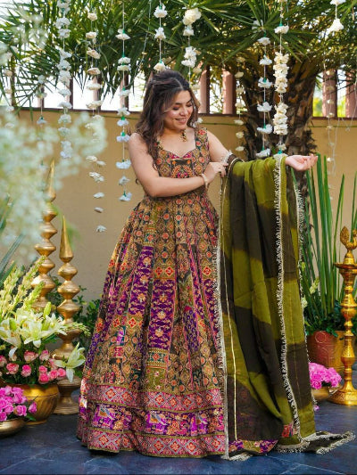 Olive Multicolour Organza Silk Gown Dupatta Set Of 2