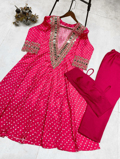 Upgrade your festive and party wear wardrobe with this stunning 3-piece suit set, beautifully crafted from soft and luxurious Chinon fabric. Featuring intricate real mirror detailing, digital prints, and delicate embroidery, this outfit is the perfect blend of elegance and comfort.