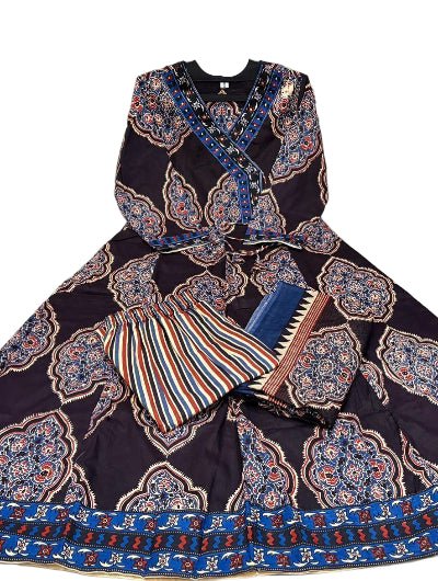 Black Katha Embroidery Angrakha Style Cotton Anarkali Suit Set