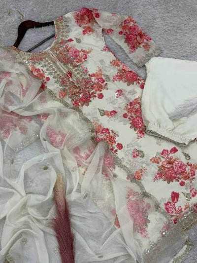 his coordinated set is designed in pure Kundan organza, showcasing fine embroidery with coding dori–sequence detailing, heavy stone–mirror handwork, and a beautifully placed digital print. The top comes with full sleeves, a micro-cotton inner layer, and a comfortable 45–46 inch length. Fully stitched and ready to wear.