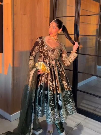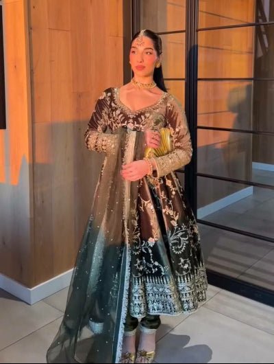 Deep Olive Green Velvet Embroidery Work Anarkali Suit