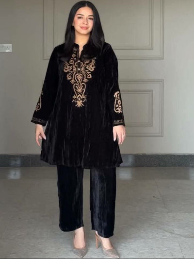 Black Rayon Silk Embroidered Kurti Pant Set Of 2