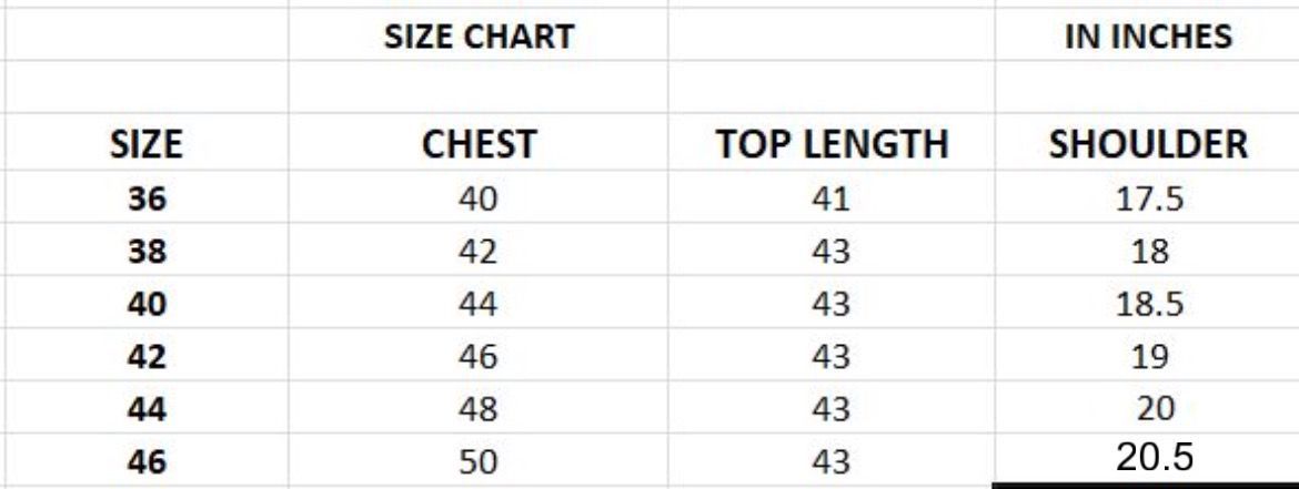 | UK Size | Chest (Kurta) | Kurta Length | Shoulder Width | Recommended Height |